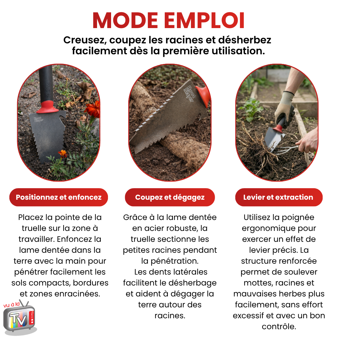 - Lame en acier renforcé pour creuser et couper les petites racines.